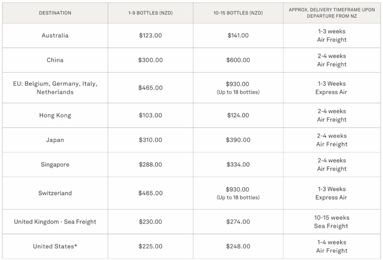 Our export destinations, costs, and approximate delivery timeframes are below.